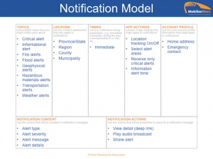 If your notifications are relevant for certain locations, consider how users will experience them when near or far from those locations. For example, if an Alberta Emergency Alert or SaskAlert App user enables the app’s current location feature, only notifications near the device current geographic location are displayed. Consider how precise your locations need to be: anywhere from within a province/state, to within a venue or even a room.